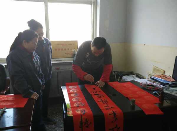 在春节即将来临之际,古塔区总工会领导为职工群众免费写春联送祝福。 在区总工会办公室,工会领导正挥毫疾书,书写着“福星高照”、“喜气洋洋”等羊年的祝福。职工群众排队等候现场书写的春联,大家脸上都洋溢着节日的笑容,索领者应接不暇,一派温馨气氛。更有几位爱好书法的职工代表也挥毫泼墨,书写自己对新春的祝愿,一展书法风采。 古塔区工会领导为职工免费写对联,送去新春问候与祝福的同时,也有助于推动2015年职工文体活动的深入开展。广大职工群众也纷纷称赞这是一项非常有意义的温暖人心活动。