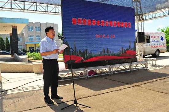 原来,这是市自来水总公司在大穆水厂开展的夏季保供水反事故演习。为了强化职工安全生产意识,检验安全生产月和百日安全生产活动成果以及公司应急预案的可行性和可操作性,提高水源应对突发事故处理能力,保障夏季用水高峰期安全稳定供水,该公司举办了演习活动。公司总经理周立军、副总经理张振义、工会主席曲运新亲临现场指挥,公司所属范围内相关单位职工参加了演习。市总工会、水务局、安监局、松山新区公安局、消防局相关领导观摩了演习。