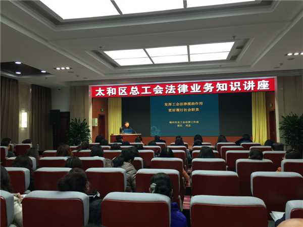 为进一步提高基层工会干部的法律业务知识水平,11月12日上午,太和区总工会在市总职工会馆4楼会议室举办了一期法律知识讲座,特邀市总工会法律部刘志部长、市委党校吴兵教授进行授课,区总工会副主席洪军主持此次讲座,区总工会全体机关干部及全区所属企事业单位工会干部百余人参加了此次讲座。