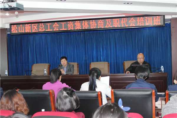 2016年3月25日上午,松山新区总工会在区九楼大会议室举办工资集体协商及职代会的培训班,市总工会民管部周晨部长授课,参与培训的有全区企业及街道社区工会主席、人力资源部部长及工会工作人员。