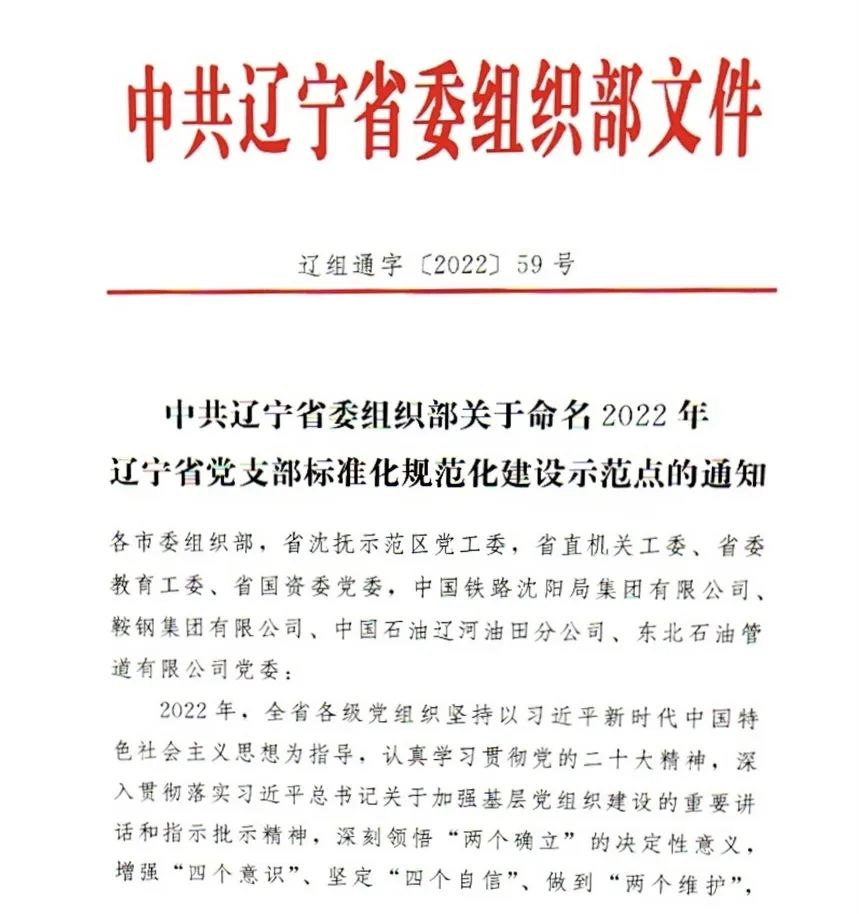 近日,中共辽宁省委组织部下发《中共辽宁省委组织部关于命名2022年辽宁省党支部标准化规范化建设示范点的通知》,公布了2022年辽宁省党支部标准化规范化建设示范点名单,我单位机关第一党支部榜上有名。