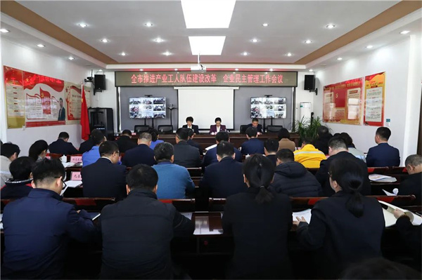 11月17日,全市推进产业工人队伍建设改革和企业民主管理工作会议召开,市产业工人队伍建设改革工作协调小组和厂务公开领导小组全体成员及联络员参加会议,市委副书记、两小组组长王丽娟作重要讲话,市政府副秘书长侯凯主持会议;各县(市、区)两小组成员及联络员在分会场以电视电话会议形式收听收看。