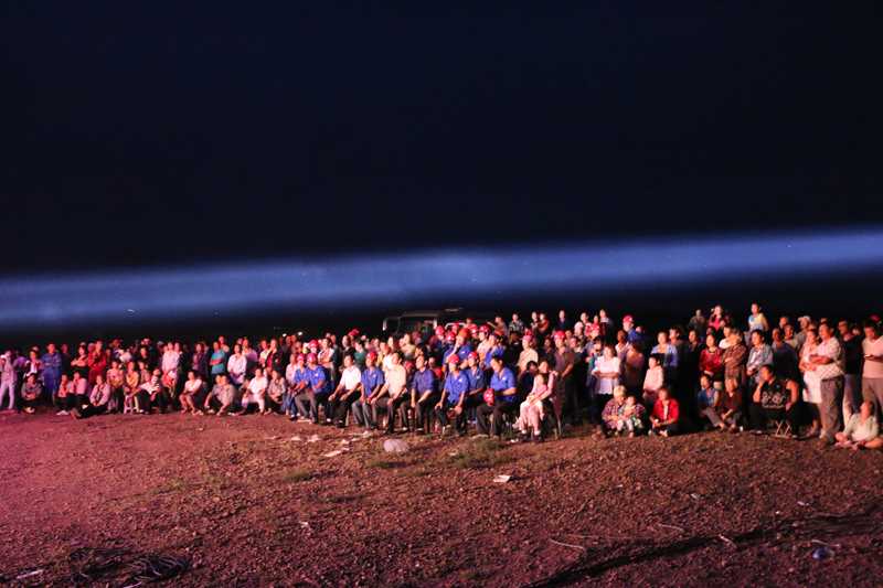 演出舞台就搭建在水库大坝下的河滩上,明亮的聚光灯束,引来旷野上成千上万的飞虫,蚊子、蠓虫、飞蛾、蝼蛄……飞虫不时地落在演员的脸上、身上……甚至会飞到演员的嘴里。可演员们没有一个惊慌害怕的,特别是四位女演员,抖落飞落在脸上、身上的虫子,坚持上台演唱?!段业纳钋槲闶睾颉肥惴⒘硕运饨ㄉ枵呙俏尴薜某缇春团ㄅǖ那橐濉ⅰ逗萌兆印纷89と耸Ω得堑娜兆釉焦胶旎?#8230;…整台晚会在《祖国万岁》的歌声中落幕。