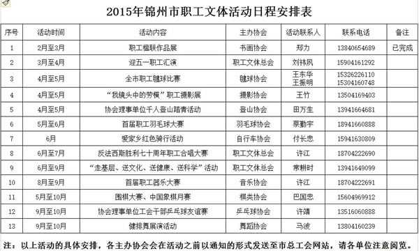 文体总会各理事单位及市直基层工会: 为认真落实市总工会第十七届委员会四次全体会议精神,进一步活跃职工业余文化生活。职工文体总会在3月11日召开了2015年职工文体总会工作调度会,对各分会开展的活动作出安排,现将2015年职工文体活动日程表发给你们,请各会员单位积极参与,密切配合。共同做好我市职工文体工作。