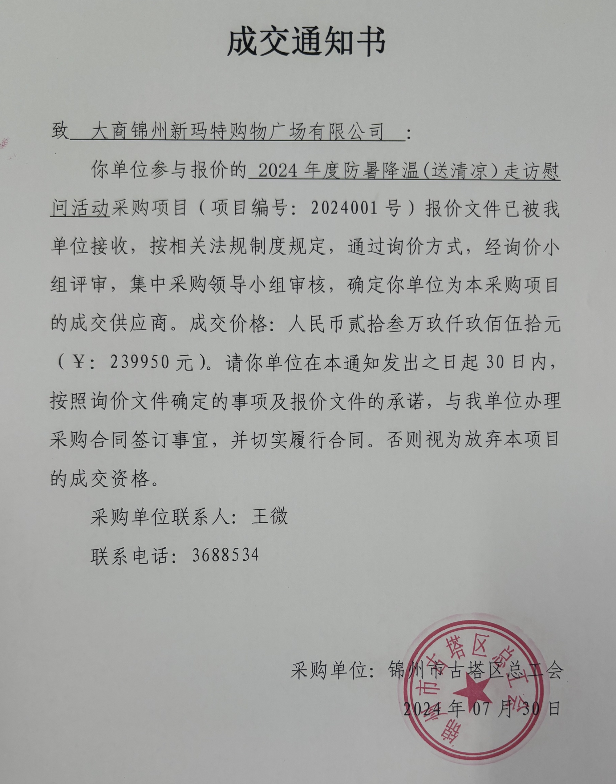 古塔区总工会关于对2024年度防暑降温走访慰问活动采购成交通知书