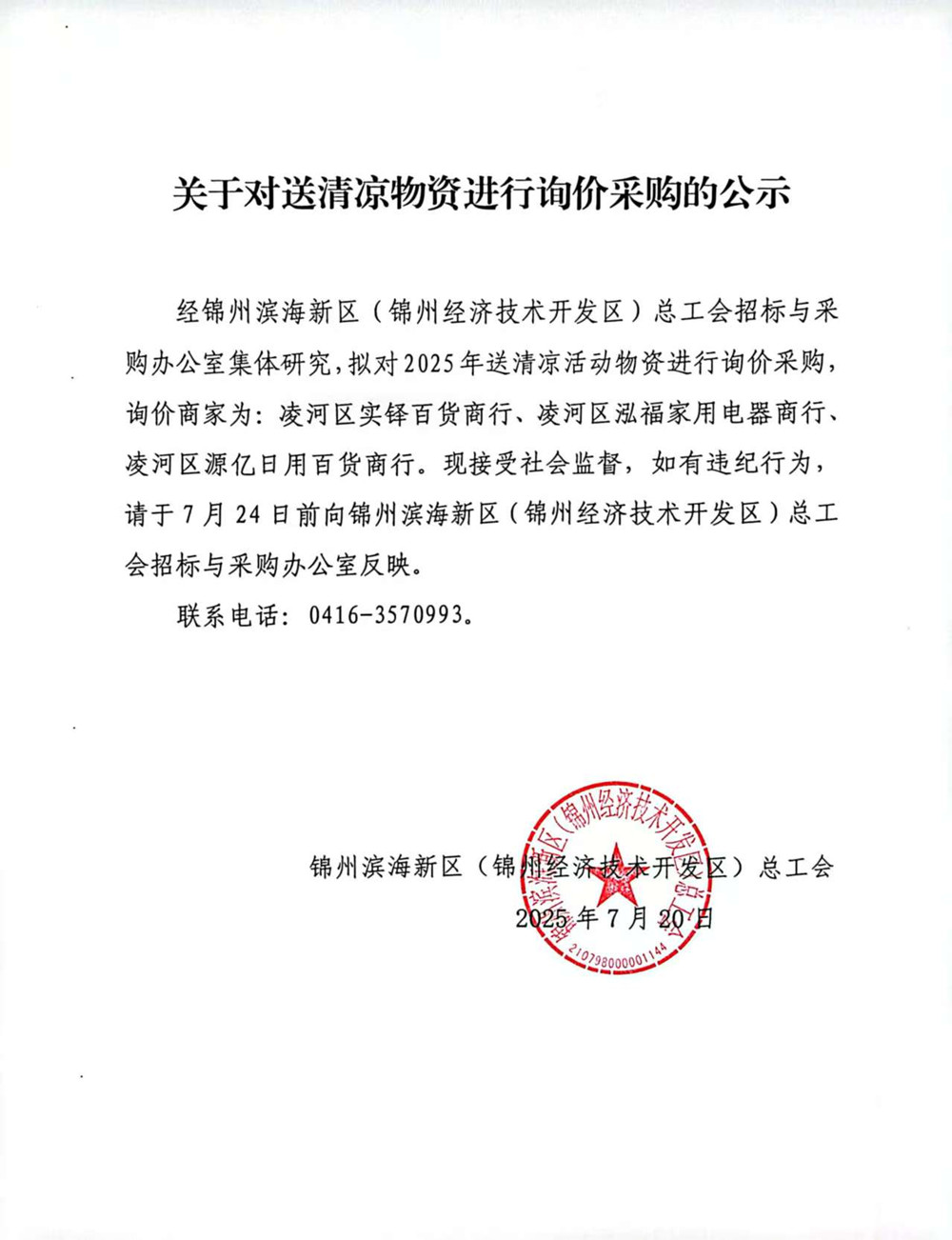 滨海新区总工会关于对送清凉物资进行询价采购的公示