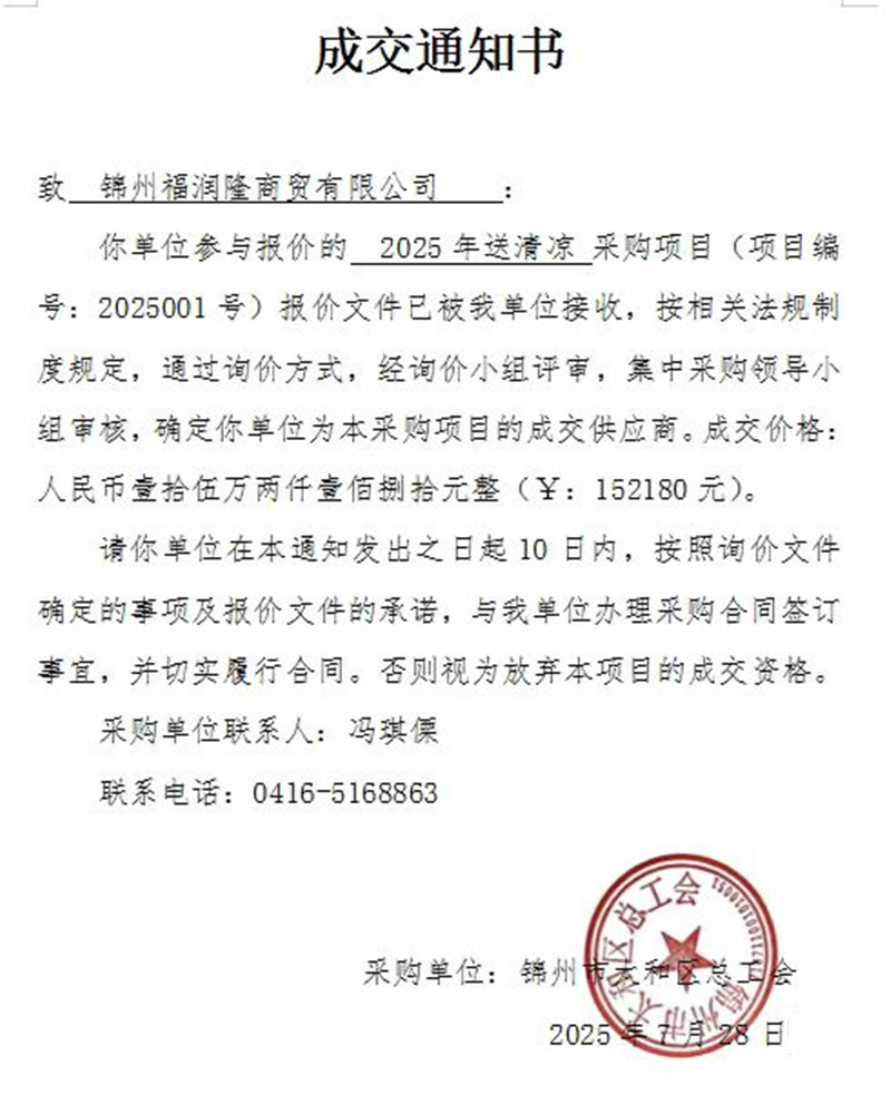 太和区总工会关于2025年送清凉采购项目的成交通知书