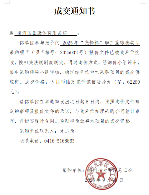 太和区总工会关于对2025年“先锋杯”篮球赛奖品采购成交通知书
