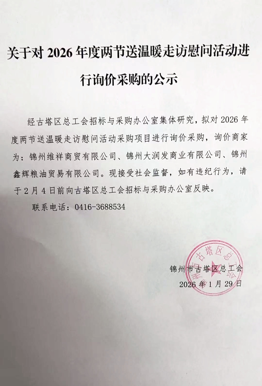 关于对2026年度两节送温暖走访慰问活动进行询价采购的公示