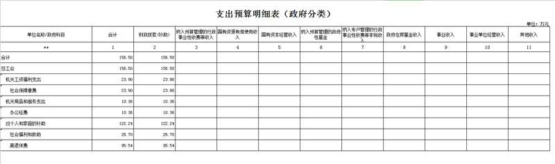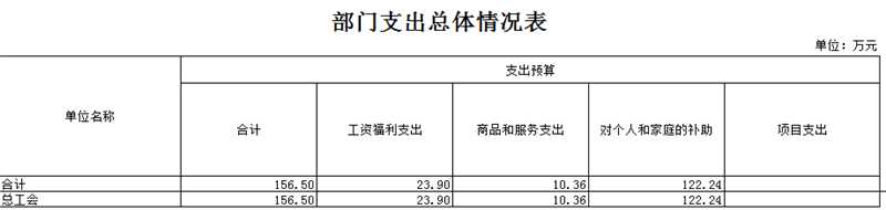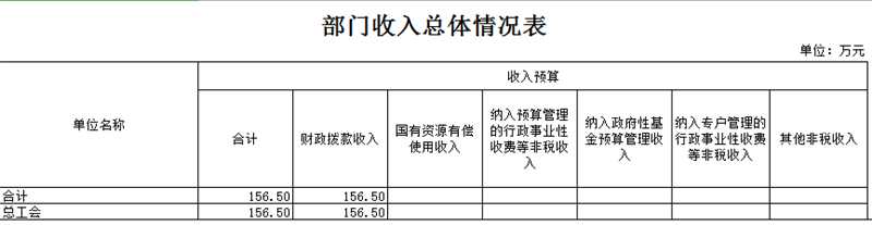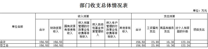 按照综合预算的原则,锦州市总工会所有收入和支出均纳入部门预算管理。收入包括:财政拨款(补助)收入;支出包括:社会保障和就业支出、卫生与健康支出等。锦州市总工会2019年收入预算总计156.50万元,支出预算总计156.50万元,收支相抵,结余为0万元。