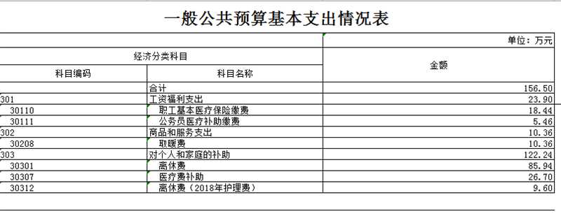 2019年度一般公共预算财政拨款基本支出156.50万元,其中:工资福利支出23.90万元,包括职工基本医疗保险缴费18.44万元、公务员医疗补助缴费5.46万元;商品和服务支出10.36万元,包括离退休人员取暖费10.36万元;对个人和家庭的补助122.24万元,包括离休费85.94万元、医疗费补助26.70万元、离休费(2018年护理费)9.60万元。