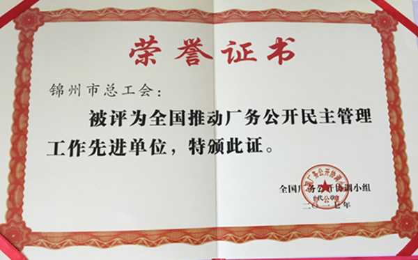 于9月29日在京召开的全国厂务公开民主管理工作经验交流暨先进单位表彰电视电话会议上,锦州市总喜获“全国推动厂务公开民主管理工作先进单位”称号,全省仅有三个市;锦州港股份有限公司、锦州供电公司也被授予“全国厂务公开民主管理示范单位”称号,全省仅有4家单位,三家单位同时获此殊荣,这在锦州工会发展过程中还是有史以来第一次。锦州市总工会主席孙志海,锦州港股份有限公司党委书记、工会主席涂冬,锦州供电公司总经理王爱华参加会议并领取了奖牌和证书。