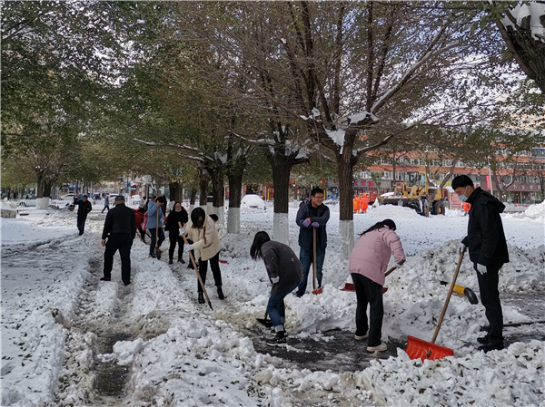 11月8日、9日,市总工会机关及所属事业单位党员干部在休息日自主扫雪之后,集中两天时间在单位院内及责任街面清雪除冰。大家面对街面上厚厚的积雪,抡起铁锹、挥动扫帚,刨的刨、扫的扫、铲的铲,配合默契,积极投身到全市清理积雪的热潮中,忙碌的身影构成了冬日里一道亮丽的风景线。