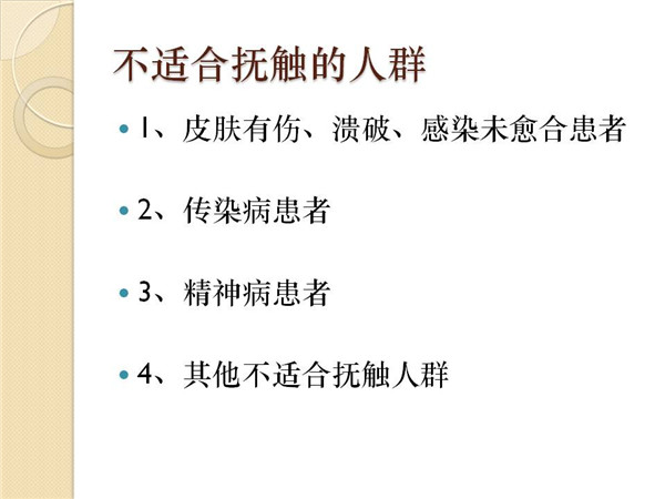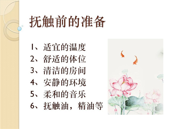 如果身边没有其他人,可以自己做给自己,找一个独立、无人打扰的空间、放一段轻柔的音乐,在音符的流淌中慢慢的闭上眼睛,用您的双手,从头到脚按着顺序进行抚触,静静的感受双手在身体上游走,这是一个身心的清理,这也是您学习爱自己的好时机,