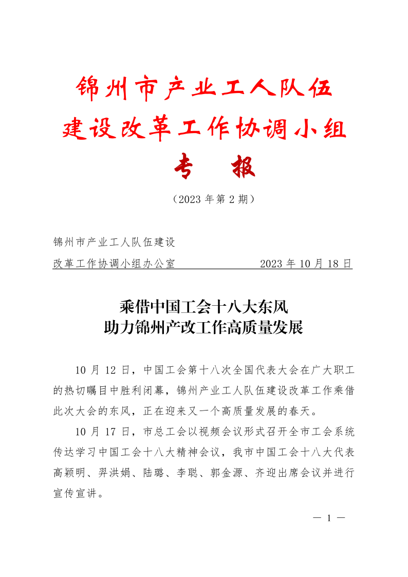 锦州市产业工人队伍建设改革工作协调小组专报(2023第2期)